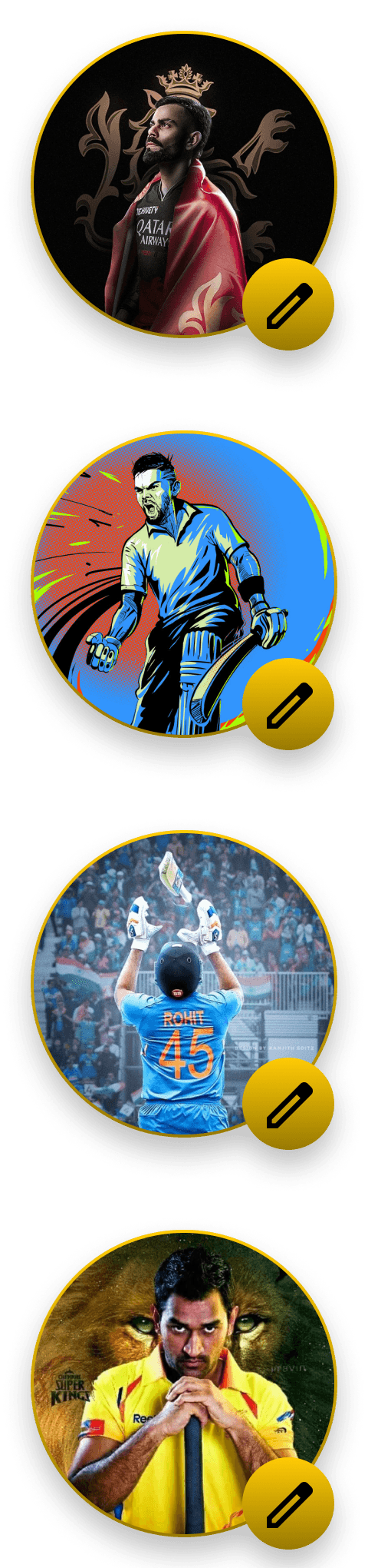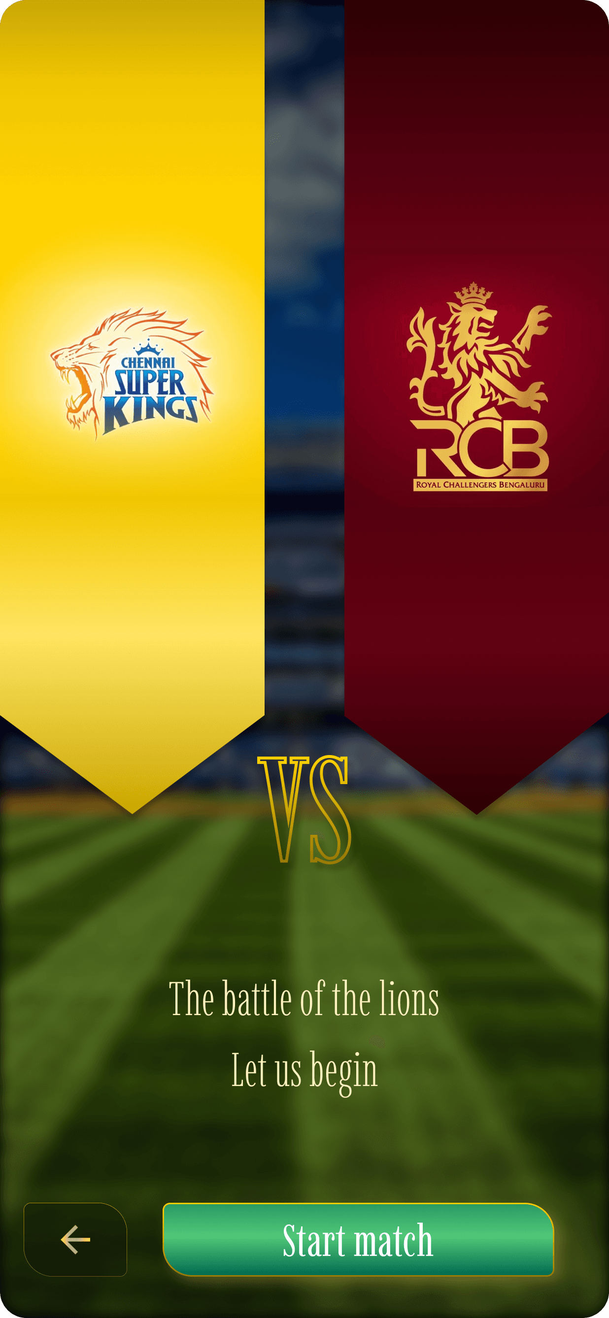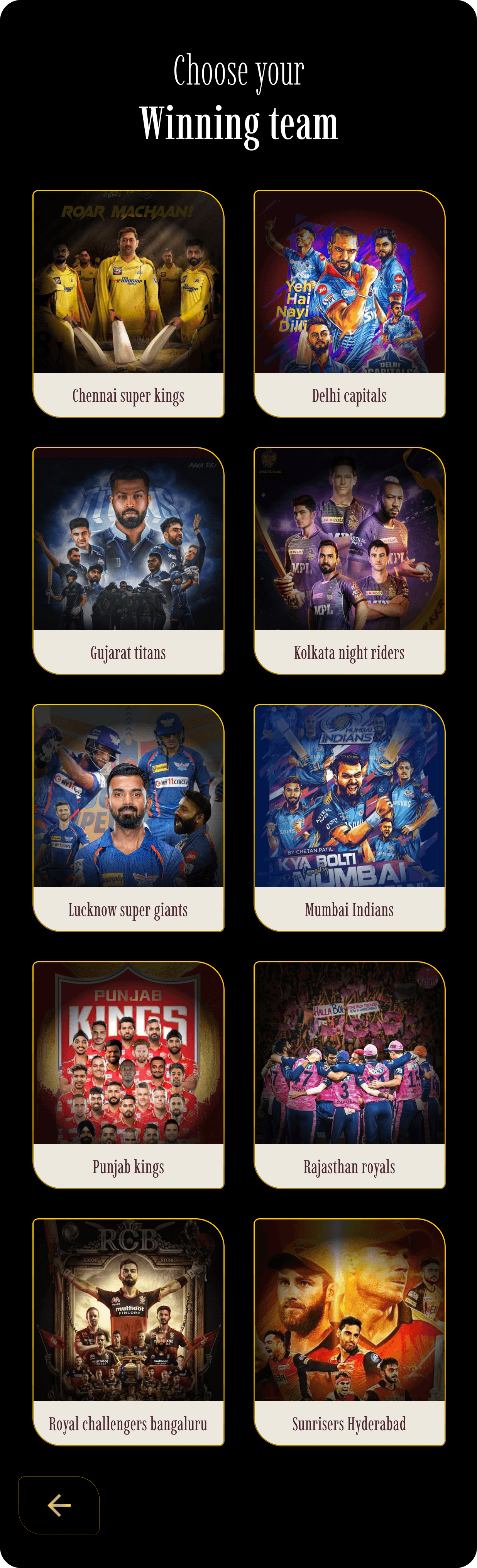 The team options are displayed based on the type of match selected, featuring a dark theme with a golden border to create a dramatic and striking effect.