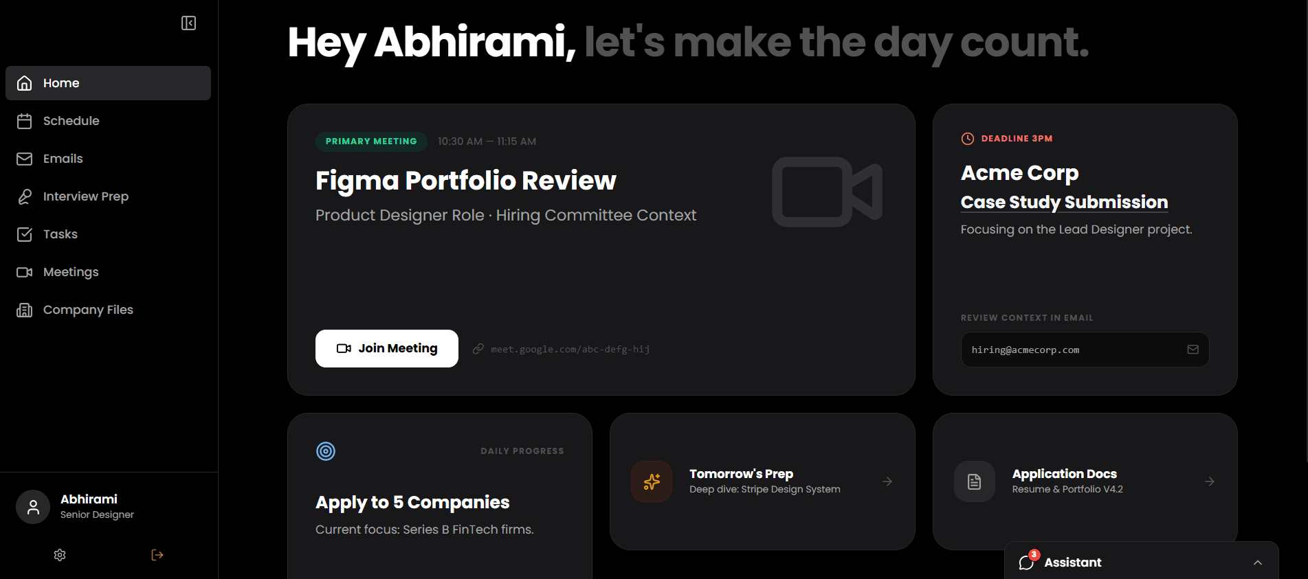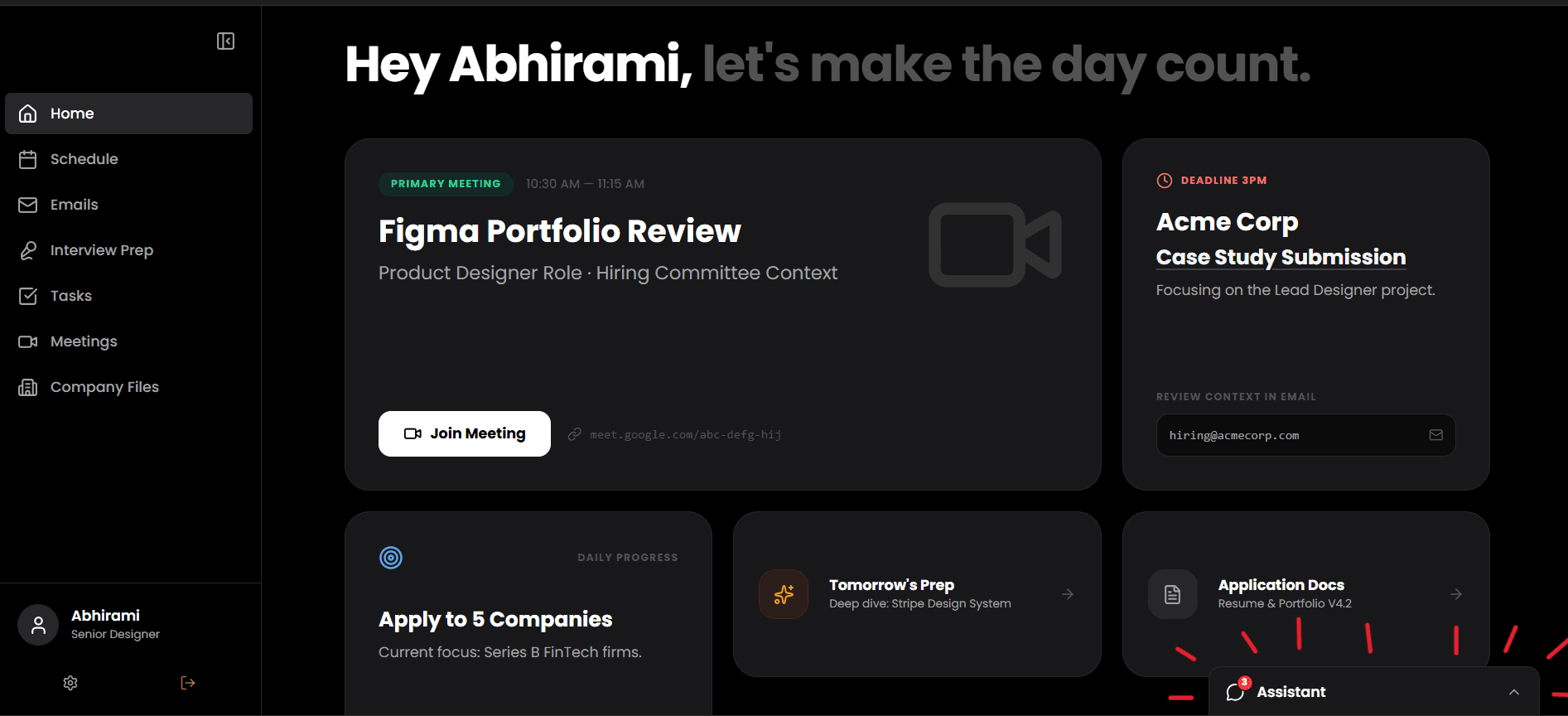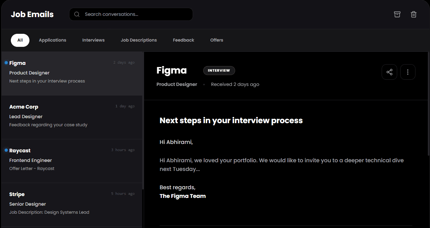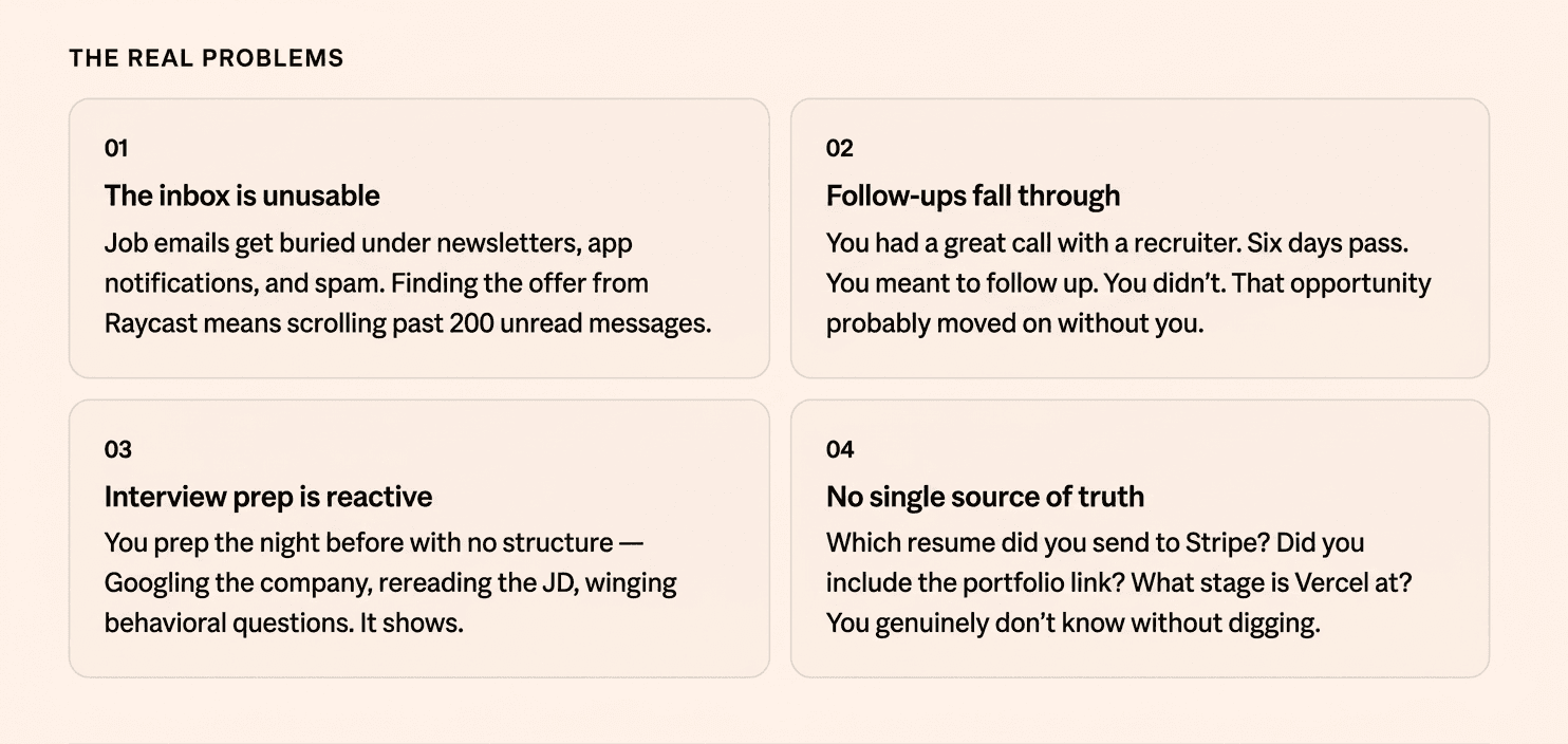 Job searching is a full-time job — yet most people manage it across a dozen disconnected tools, losing track of follow-ups, deadlines, and company context along the way. This project redesigns that experience as a single, browser-based workspace that brings emails, tasks, meetings, and company history into one organised system. The result is less time managing the chaos, and more time actually moving forward.
