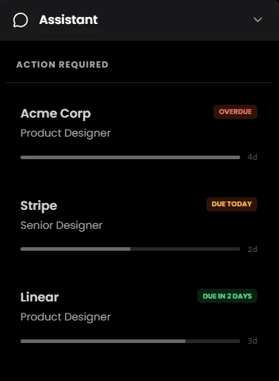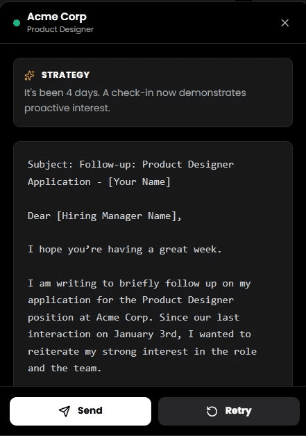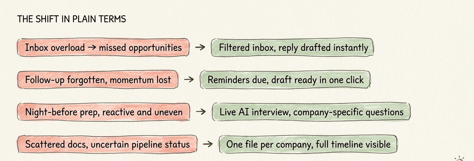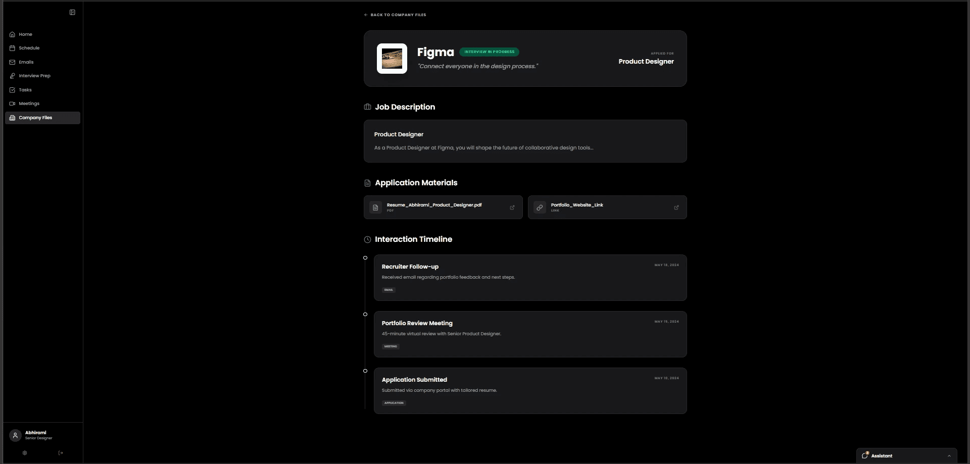 Every application lives in a company file: the JD you applied to, the documents you sent, the interaction timeline, the current stage. The pipeline board shows everything at a glance. So you always know exactly where you stand with every company, without opening a single email.