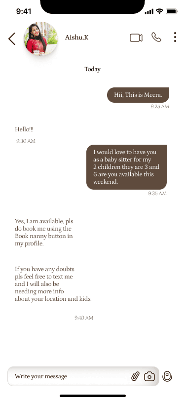Connect directly with your chosen nanny through our chat feature. This allows you to communicate easily.