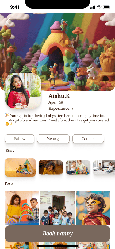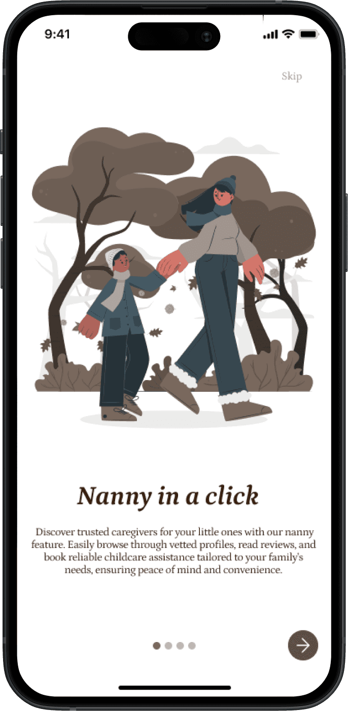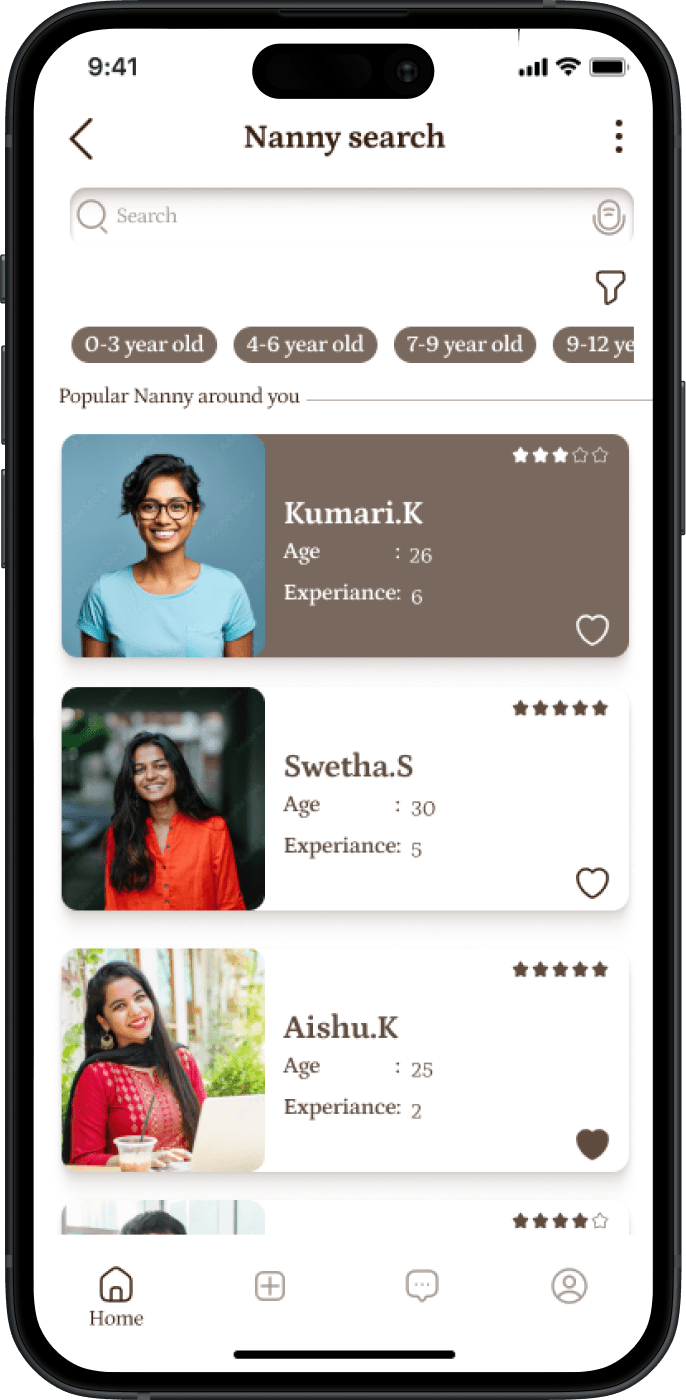Discover your perfect nanny effortlessly with our search or filter options, tailored to your preferences. Plus, take advantage of our rating and messaging features to connect directly with your chosen caregiver, ensuring a seamless and trusted experience.